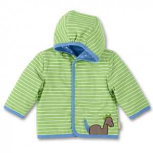 Hübsche Babykapuzenjacke aus Jersey, gefüttert mit uni Jersey und Ringeljersey. Auf der Vorderseite befindet sich eine süße Applikation.